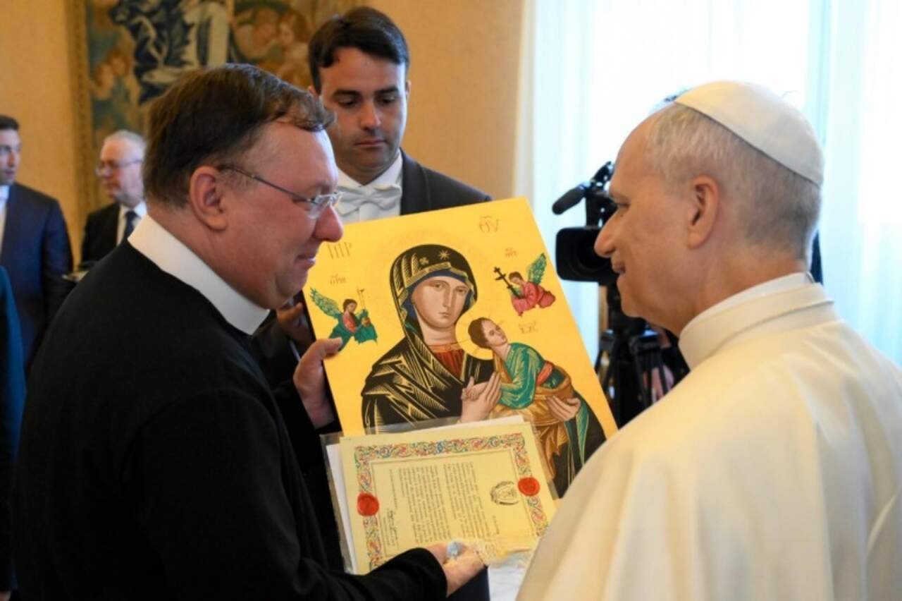Presente na audiência dos bispos com o Santo Padre, o Superior Geral Redentorista, Pe. Rogério Gomes, C.Ss.R., presenteou Leão XIV com um ícone de Nossa Senhora do Perpétuo Socorro.