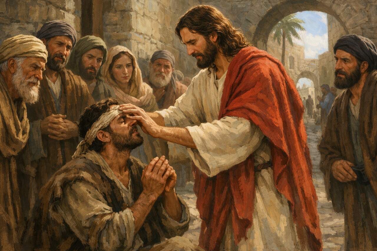 Jesus passa, vê o homem cego e não permanece indiferente à sua dor. Esse detalhe é muito significativo: Cristo percebe o sofrimento humano e se aproxima para restaurar, curar e dar vida nova.