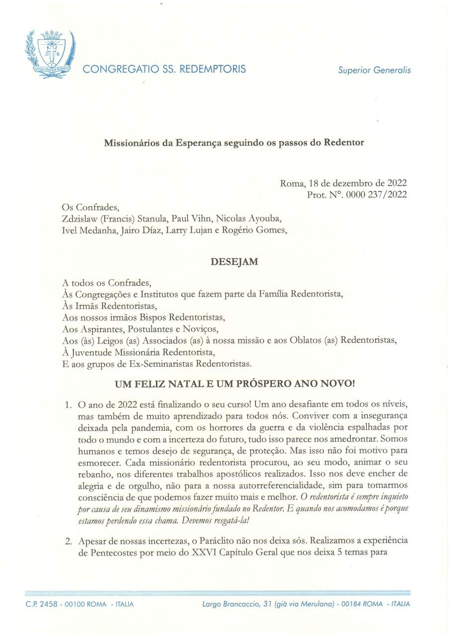 O texto é assinado pelo Pe. Rogério Gomes, C.Ss.R, Superior Geral, e pelos conselheiros: Pe. Zdzislaw Stanula, C.Ss.R, Pe. Jairo Diaz, C.Ss.R, Pe. Ivel Mendanha, C.Ss.R, Pe. Nicolas Ayouba, C.Ss.R, e pelo Ir. Larry Lujan, C.Ss.R.