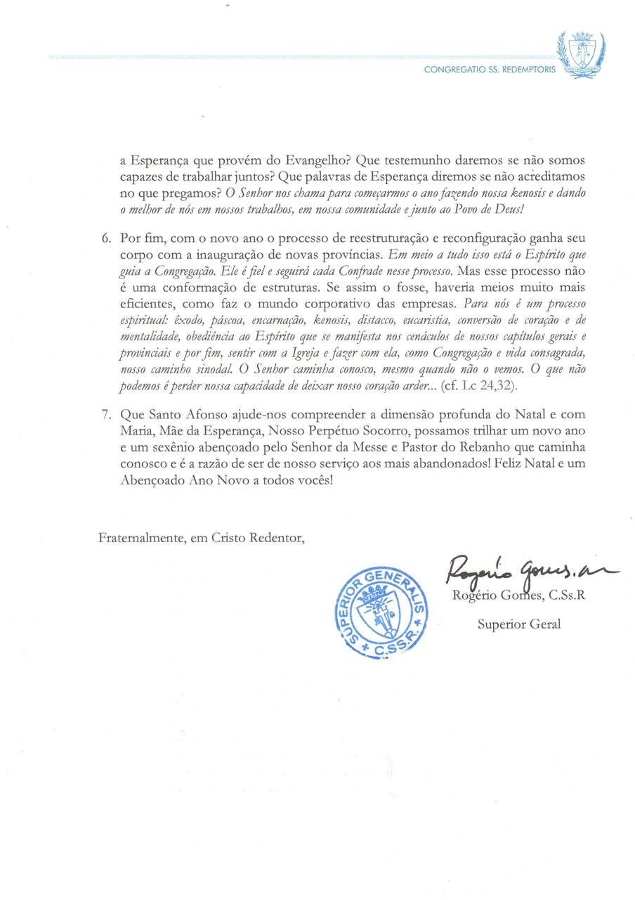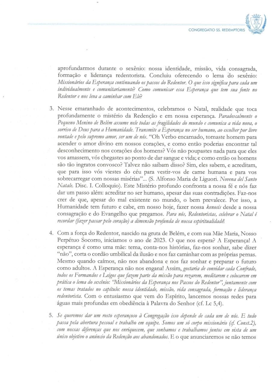“Nesse emaranhado de acontecimentos, celebramos o Natal (...) Este Mistério profundo confronta a nossa fé e nos faz dar um passo além: acreditar no ser humano, apesar de suas contradições. Faz-nos crer de que, apesar do mal existente no mundo, o bem prevalece. Por isso, a Humanidade tem futuro e cabe, em nosso hoje, fazer nossa kenosis desde a nossa consagração e do Evangelho que pregamos. Para nós, Redentoristas, celebrar o Natal é recordar (fazer parte pelo coração) a dimensão profunda de nossa espiritualidade!”.