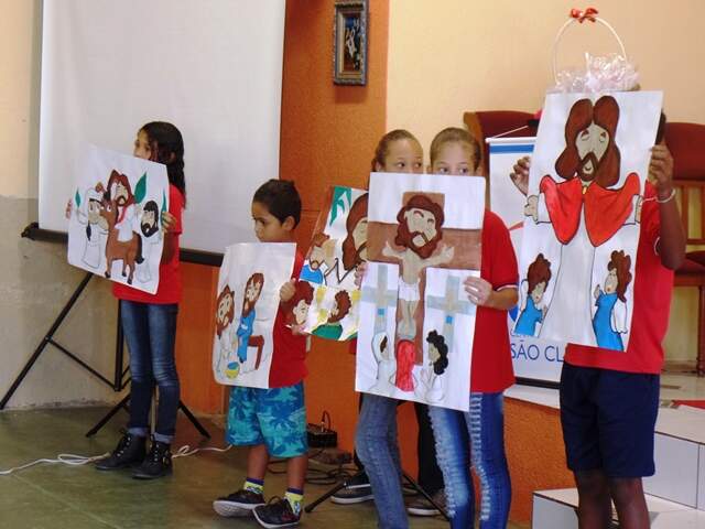 Crianças e adolescentes atendidos na Oficina de Artes na Procissão do Ofertório conduziram os símbolos pascais, no qual houve a explicação do significado de cada um.
