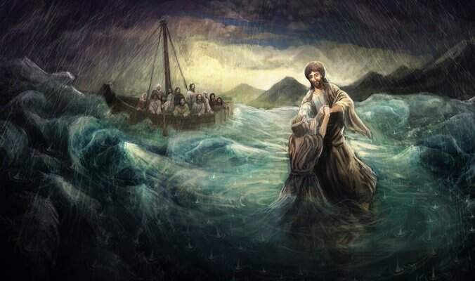 Pedro, então, começa a andar sobre as águas. Mas, ao perceber o vento, fica com medo e começa a se afundar. Ouvindo o clamor daquele homem, Jesus estende a mão para salvá-lo.
