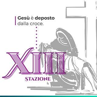 Si considera in questa tredicesima Stazione l'acerbissimo dolore di Maria nel vedersi fra le braccia l'insanguinato cadavere del divin Figlio. Deh! guardiamoci dal rinnovare sì gran tormento alla Vergine coi nostri peccati, i quali sono una nuova crocifissione di Gesù Cristo. Ora conosco, o gran Vergine, l'eccesso dei miei falli, dacchè diedero la morte a Colui che era immortale. Me ne dolgo perciò quanto posso, e risolvo di soffrire qualunque pena anzi che rinnovare colla mia morte la crocifissione del vostro Figlio. Voi però, o Maria, che ben sapete quanto io sia fragile ed incostante, ottenetemi la forza di essere sempre fedele a così doveroso proponimento.