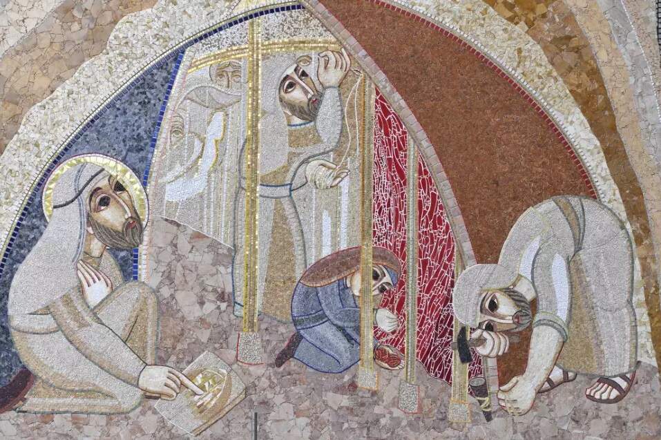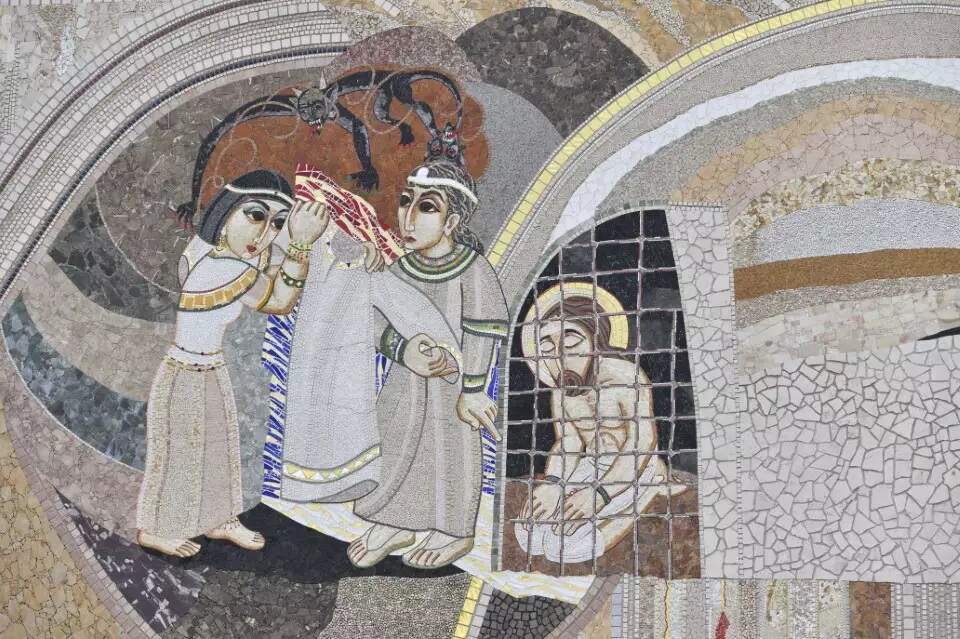 Os mosaicos mostram a construção do véu que divide o templo. Entre os trabalhadores está uma singela e sutil representação da Virgem Maria trabalhando na confecção do tecido. Santo Efrém, o sírio, afirmou que na anunciação Maria é a costureira que tece o templo verdadeiro, a carne de Cristo.