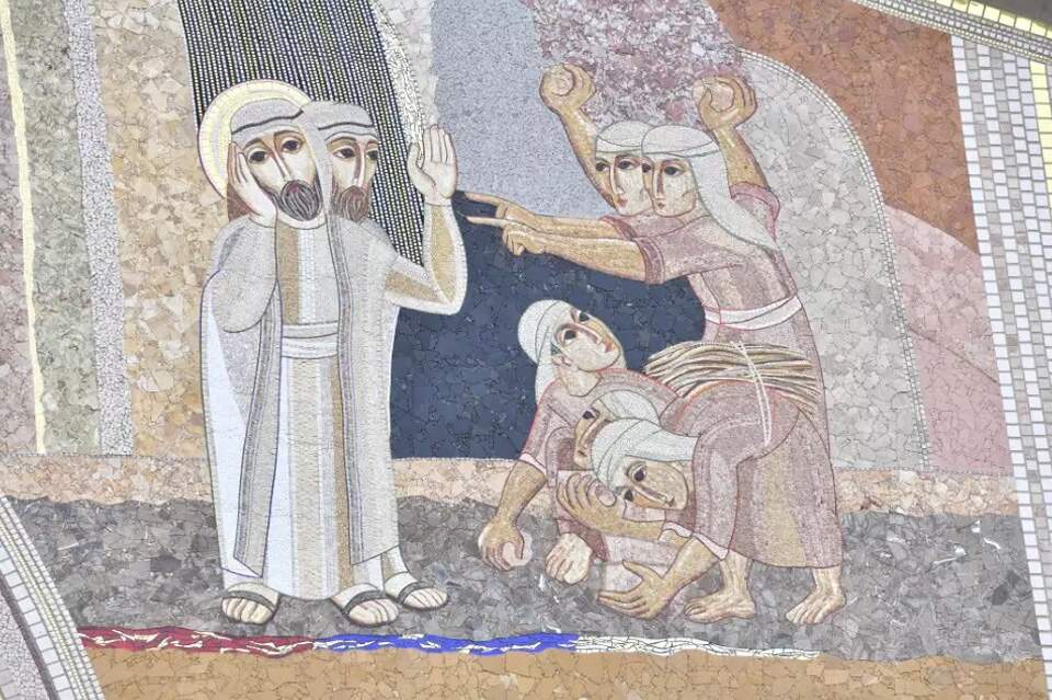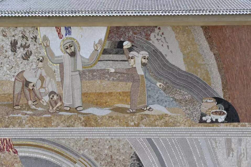A água é vida. Jacó, com seus filhos, não têm a vida. A vida é quando um reconhece o outro: eu sou porque você é. Isso é o que os irmãos ainda não conseguem entender, por isso, não são irmãos. E então eles o vendem para o Egito por vinte moedas de prata, representadas no mosaico junto aos negociantes e o camelo.