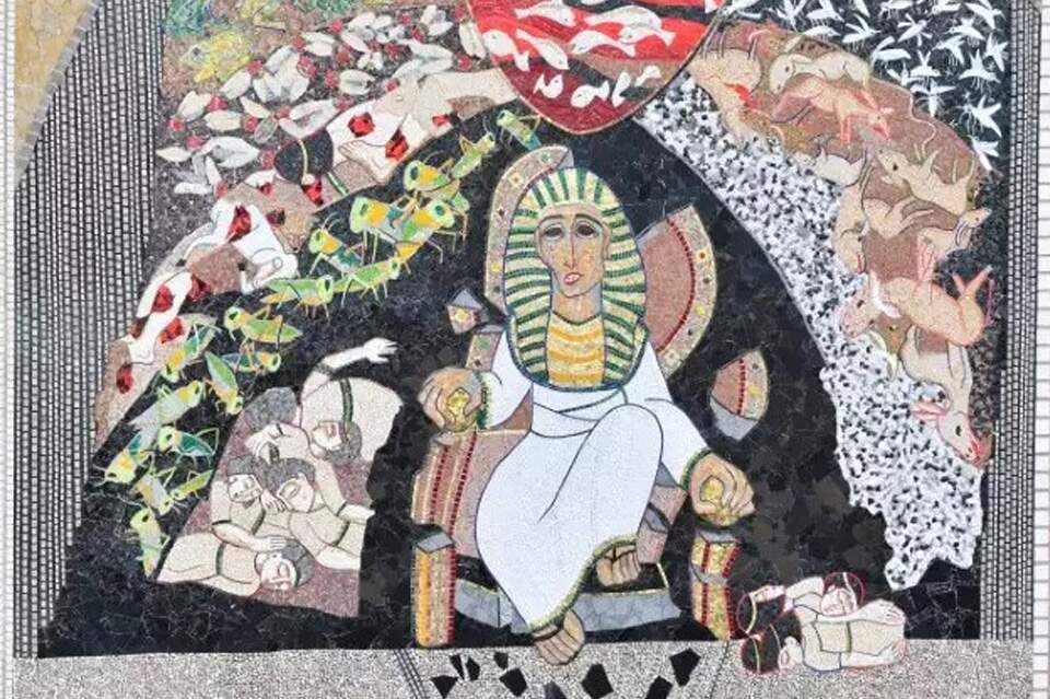 Sua figura, representada no mosaico, está ao centro, sobre um trono que desmorona, pois é outro que move as coisas desta terra e começa a libertar o cosmos do pecado humano. Sua face está confusa, como quem não compreende os acontecimentos. Ao redor dele, as pragas do Egito, descritas pelo próprio Deus como maravilhas (Êx 7,3). O fundo é preto, demonstrando como o homem sente seu poder arruinado quando já não pode mais dominar.