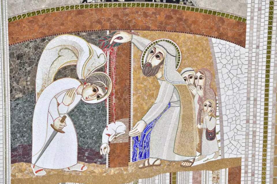 Na representação do mosaico, vemos Moisés escrevendo na soleira da porta com sangue. O anjo exterminador se inclina diante da porta, pois viu o sangue. São Tiago de Sarug, um monge e bispo sírio, diz: Como é possível que o anjo se incline diante do sangue do cordeiro? Não é possível! Mas ele se inclina, pois naquele sangue reconhece o sangue do Cordeiro verdadeiro, Cristo. É Ele o cordeiro de Deus que tira o pecado do mundo (Jo 1,29).