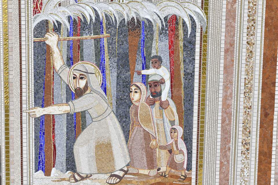 Na representação da fachada podemos ver, na cena da passagem do Mar Vermelho, a mão de Moisés com seu bastão indicando o alto da arcada, onde está a visão apocalíptica do céu aberto com o ancião, o trono, o cordeiro e os seres viventes, bem como o martírio de Santo Estêvão à esquerda e o batismo de Jesus à direta. Essas são as realidades futuras, que ainda não vivemos, mas que cremos e professamos. A outra mão de Moisés aponta para a entrada do Santuário, lugar onde os peregrinos entram para o corpo de Cristo (isso é ser cristão), para se descobrirem mergulhados na comunhão do Pai, do Filho e do Espírito Santo, tal como vemos escrito nos mosaicos sobre o nártex (pórticos antes da entrada) da Basílica.