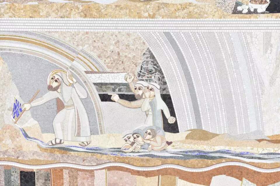 Moisés nasce quando era proibido nascer. O faraó havia ordenado a morte de todos os meninos de Israel que nascessem, jogando-os no Nilo. No mosaico, duas mulheres — que simbolizam muitas — atiram crianças, cumprindo a ordem do Faraó. A mãe de Moisés também o coloca no Nilo, mas não o atira. O coloca lá em uma cesta que simboliza a Arca de Noé. Assim, a filha do Faraó, que se banhava perto dali, o encontra entre os juncos e fica com ele.