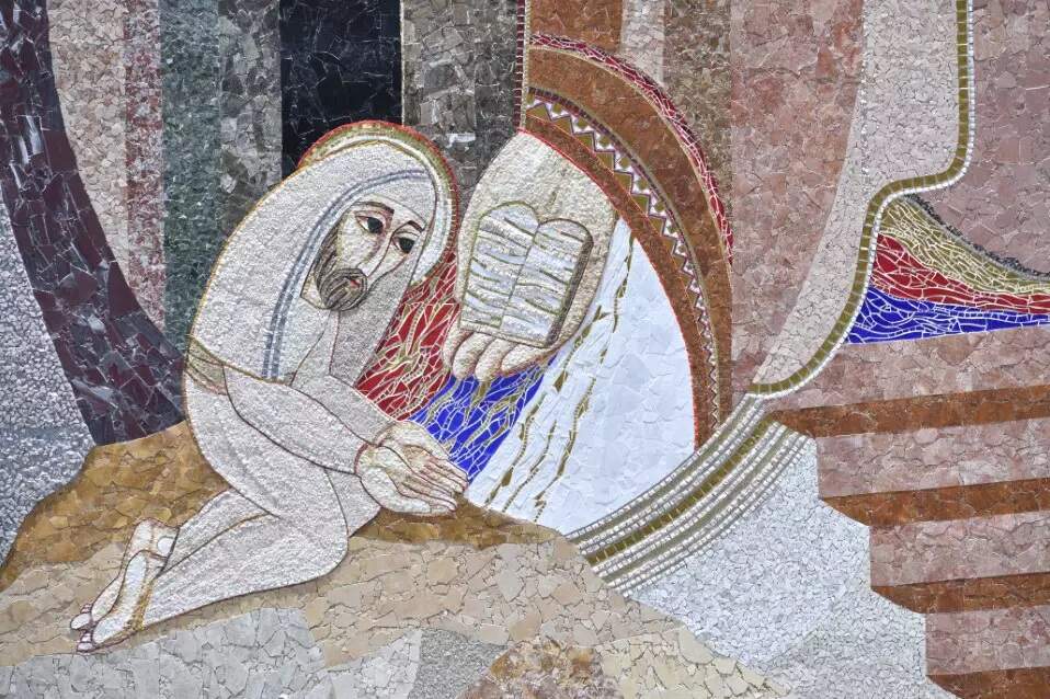 No alto do Monte Sinai Moisés acolhe as duas tábuas da lei como se acolhesse um dom, recebido pela grande mãe de Deus. Ele é muito humilde, e todo entregue, abre as duas mãos recebendo de Deus essa Lei.