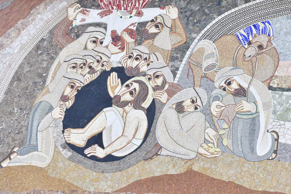 Atiram-no em uma cisterna vazia, o que diz tudo. A cisterna é feita para água e está vazia. No mosaico, José é retratado sem encostar na cisterna, pois é sustentado por Deus.