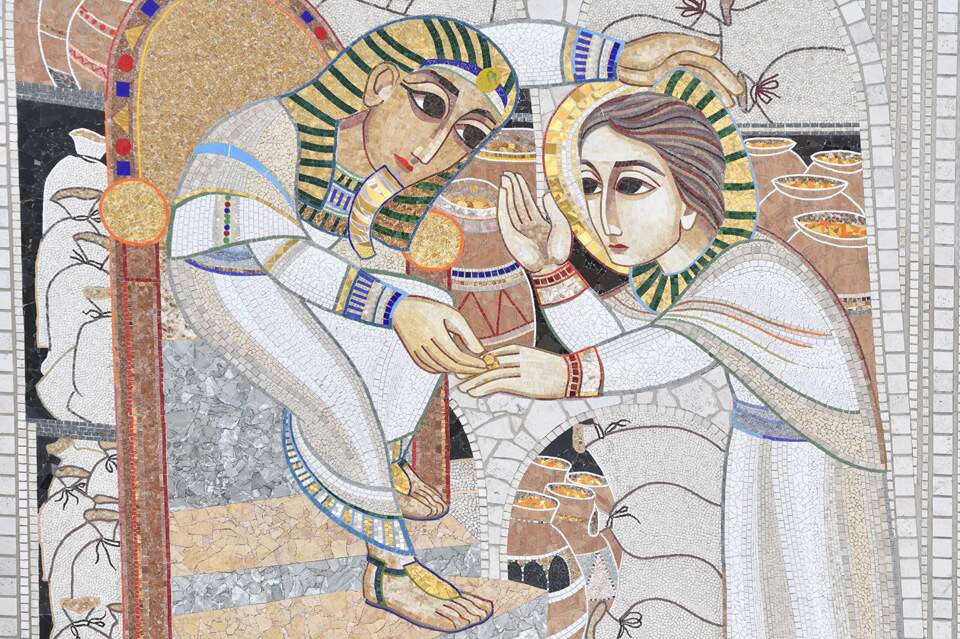 No mosaico, o Faraó é retratado descendo de seu trono para demonstrar que não é José quem quer uma carreira, pois ele não almeja isso, mas apenas aceita tudo o que acontece. Por isso, seguindo os desígnios divinos, ele é investido pelo próprio Rei do Egito como governador, representado pelo anel colocado em seu dedo e um colar de ouro.