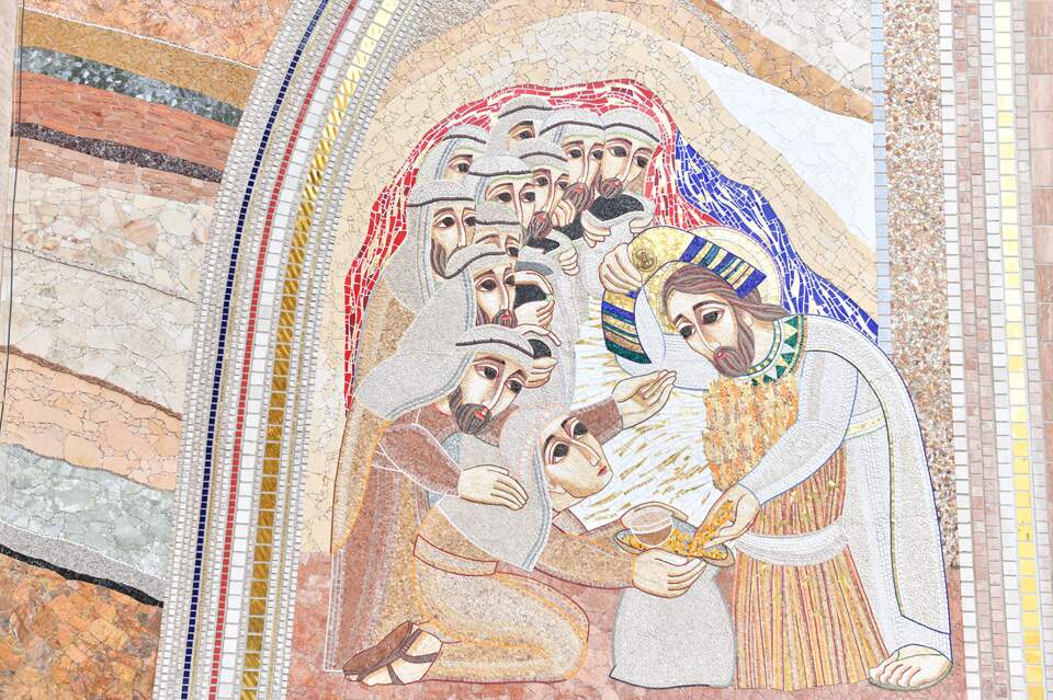 Na representação do mosaico, apresenta-se a murmuração contra Deus e as saudades dos alimentos, representados em uma panela. Ao mesmo tempo, parte do povo recolhe o maná e as codornizes, buscando alimentos.
