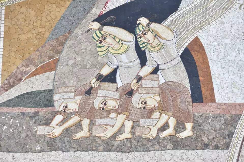 O Egito é lido espiritualmente, nas tradições hebraica e cristã, como imagem do pecado. O faraó é a imagem do pecado e o pecado domina. Por isso, no mosaico, os hebreus são golpeados e levados à terra. Eles trazem na cabeça tijolos que fabricavam, símbolos da Torre de Babel (Gn 11) e do trabalho do solo, herança da expulsão do Paraíso (Gn 3,23). Eles estão curvados, pois, por causa de seu pecado, agora devem trabalhar o solo de onde vieram (Gn 3,19).