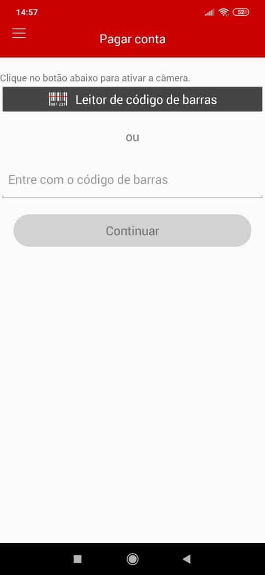4. Nesta tela, você pode escolher se prefere digitar o código de barra ou fazer a leitura do código. Se escolher a opção de leitura, basta apontar a câmera do seu celular para o código de barras do boleto.