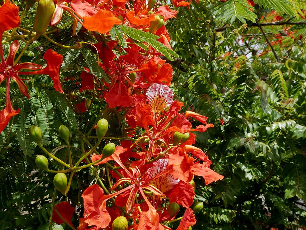 Suas folhas lembram as de uma samambaia, sendo bem delicadas e divididas em pequenos folíolos. O flamboyant prefere locais com bastante sol e solos bem drenados, e não suporta geadas.