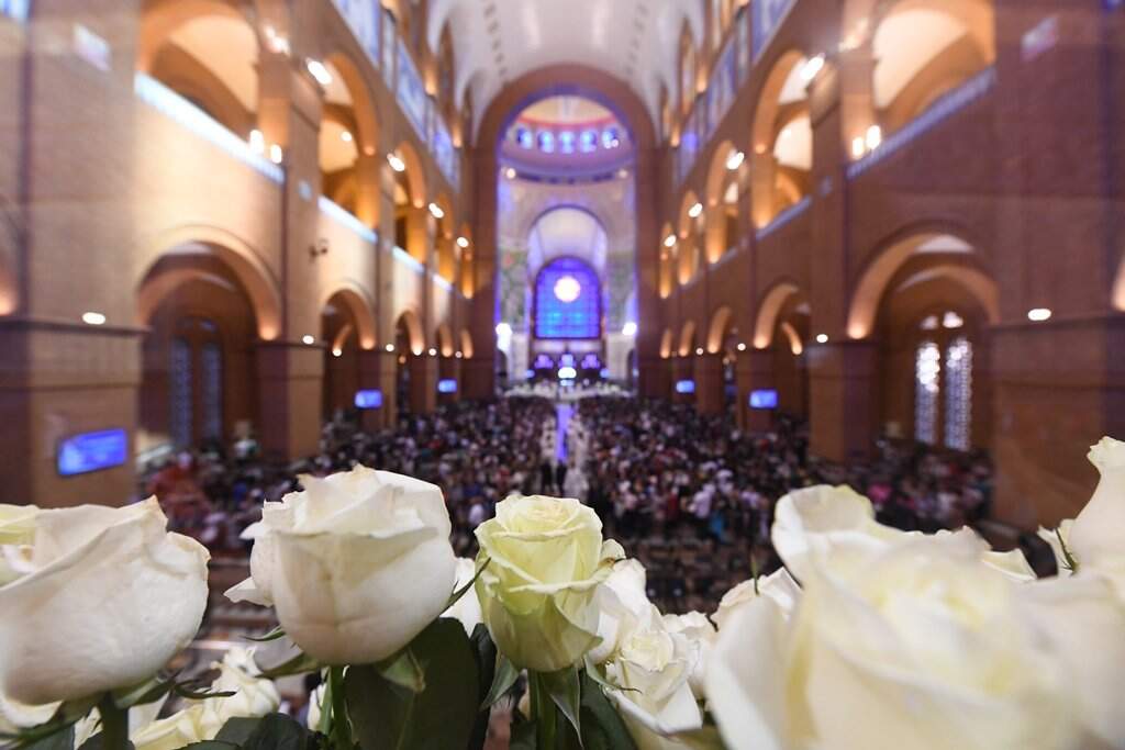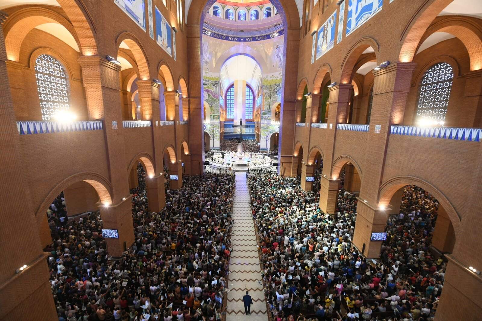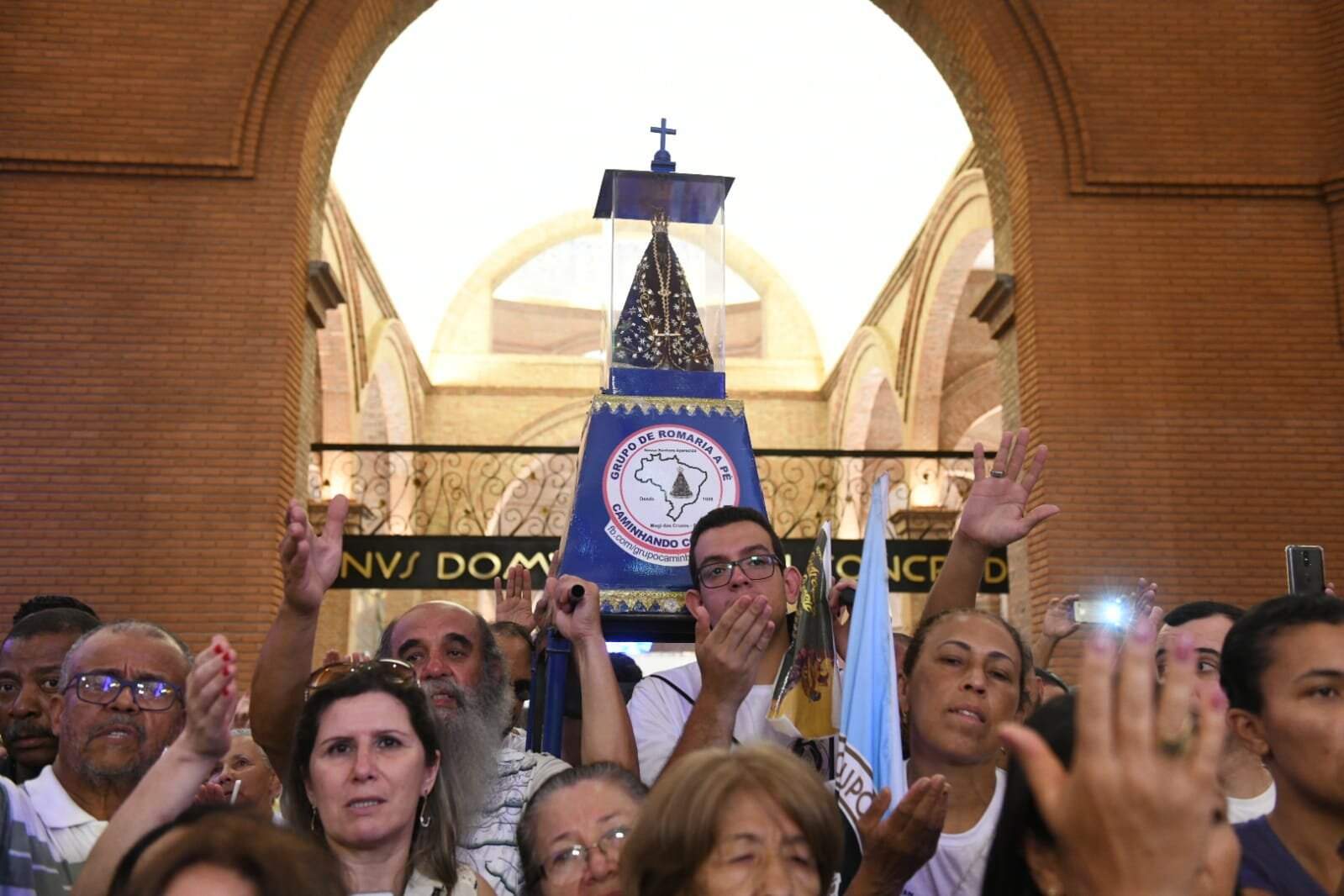 Às 9h00, a Missa Solene reuniu outros milhares de romeiros que se revezam dentro do Santuário. Afinal, todos querem ter um momento ali diante de Maria e de seu Filho Jesus.