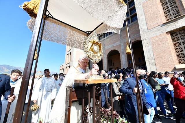 “Os fiéis poderão seguir a Jesus Eucarístico, exposto no ostensório, partindo da nave Leste da Basílica, passando pela Norte e novamente ingressando no Santuário pela nave Oeste”, explica o Prefeito de Igreja do Santuário Nacional, padre Diego Antônio. A celebração termina com a benção do Santíssimo Sacramento.