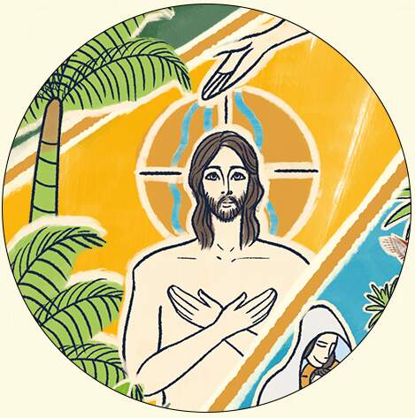 “Jesus sendo batizado por João Batista e o Espírito Santo pairando sobre sua cabeça. O mesmo Espírito que pairava sobre as águas na criação do mundo, agora paira sobre Aquele por quem tudo foi criado". (Cl 1,16)
