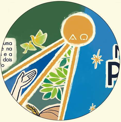 As cores também catequizam. O azul representa o céu, a espiritualidade e o mistério da fé. Já o dourado é a luz divina, o brilho da presença de Deus e a glória da ressurreição. O verde, a criação, a esperança e o cuidado com a casa comum. Por sua vez, o marrom e o laranja remetem à terra, à vida concreta e encarnada, à humanidade de Cristo. E, por fim, o branco simboliza a pureza, a paz, a reconciliação e o início de um novo tempo.