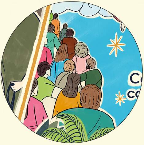 A multidão de pessoas ao centro, formada por homens e mulheres, famílias, migrantes, pobres, vulneráveis e devotos que, ao mesmo tempo, escutam a Palavra de Deus e a põem em prática, representa o Povo de Deus em caminhada. São os devotos, a Família dos Devotos, os “peregrinos da esperança”, pois Maria é a grande guia da caminhada espiritual do Povo.