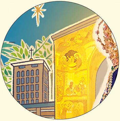 Todas as cenas iniciais convergem e se iluminam no centro da composição, como se formassem um vitral espiritual. Os três raios dourados que descem sobre elas representam o trecho do Magnificat, quando Maria canta: “Minha alma engrandece o Senhor e meu espírito se alegra em Deus, meu Salvador, porque Ele olhou para sua humilde serva”. (Lc 1, 46-47)