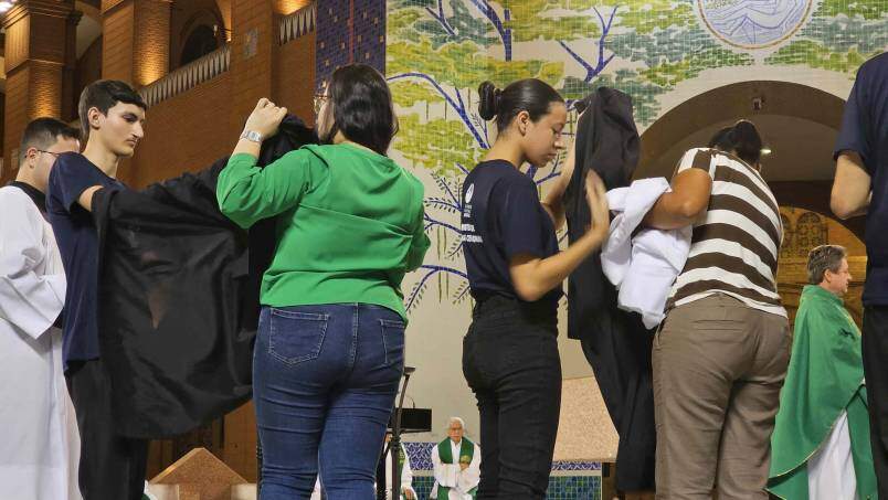 Padre Catalfo abençoou as vestes litúrgicas que serão usadas no serviço e missão no Santuário Nacional. Familiares e padrinhos ajudaram os coroinhas e acólitos a colocarem suas vestes para então iniciar a missão de servir a Deus.
