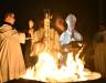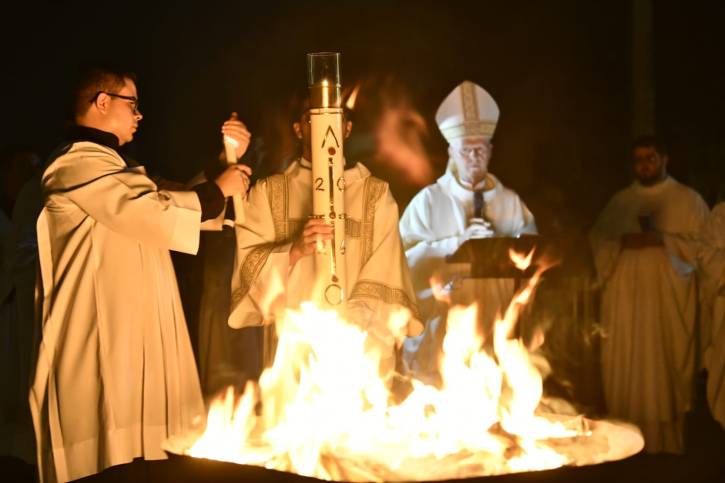 A Vigília teve início na área externa do Santuário, no Memorial dos Construtores, com a bênção do fogo novo. O gesto simboliza Cristo ressuscitado, luz que vence as trevas.