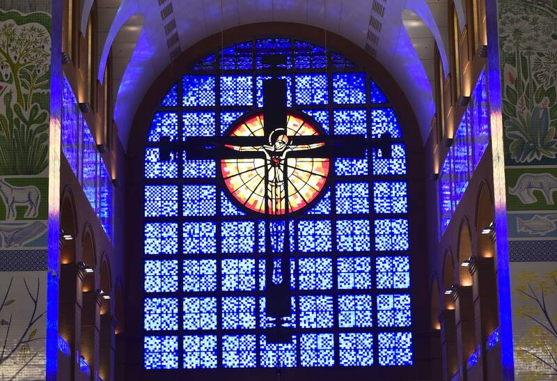 As artes de Claudio Pastro também podem ser conferidas nos vitrais da Basílica, feitos para valorizar o ambiente com seu efeito decorativo, artístico e espiritual. Os vitrais têm a função de filtrar a luz, refletindo tons variados no espaço e nos peregrinos. A luz é a imagem do Ressuscitado, dando a conotação da Transfiguração.