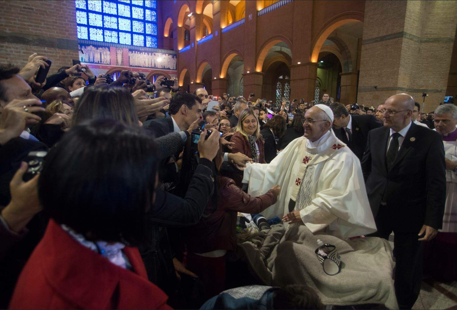 Do lado de fora do Santuário, o Papa abençoou os milhares de fiéis que o esperavam. Francisco pediu desculpas por não falar em “brasileiro”, disse que falaria em espanhol e se desculpou mais uma vez. Nos intervalos de suas falas, foi ovacionado pelo público.
