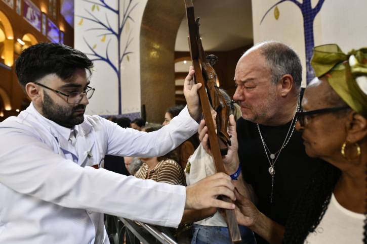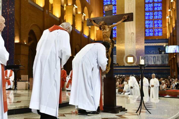 A celebração seguiu com a Oração Universal, em que o reitor do Santuário Nacional, Pe. Eduardo Catalfo, C.Ss.R., rezou por toda a Igreja, pelos governantes e pelos que sofrem. Logo após, ocorreu a Adoração da Cruz, o momento em que os fiéis contemplam o "lenho do qual pendeu a salvação do mundo".