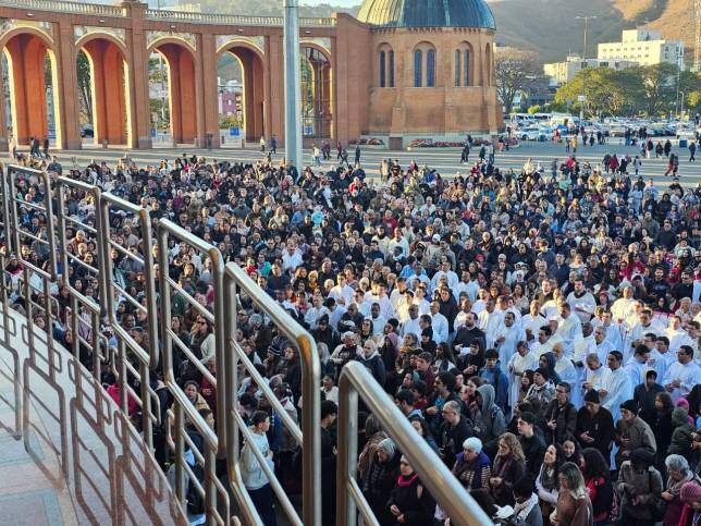 Após a celebração eucarística, os romeiros e devotos seguiram em procissão até a Tribuna Bento XVI, onde participaram de um momento de oração do Santo Terço, coroação e consagração à Nossa Senhora Aparecida.