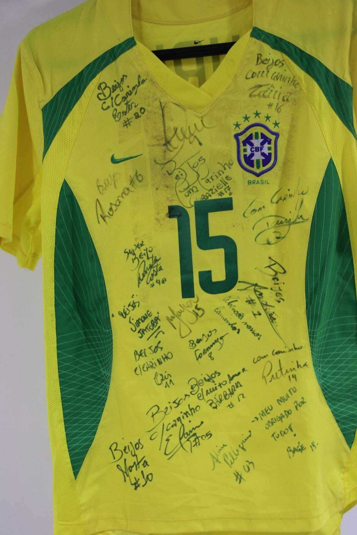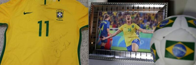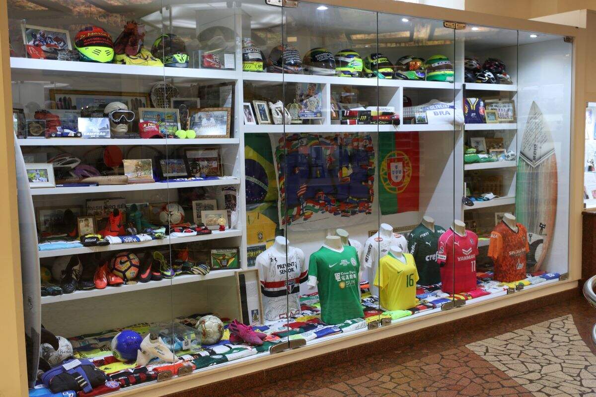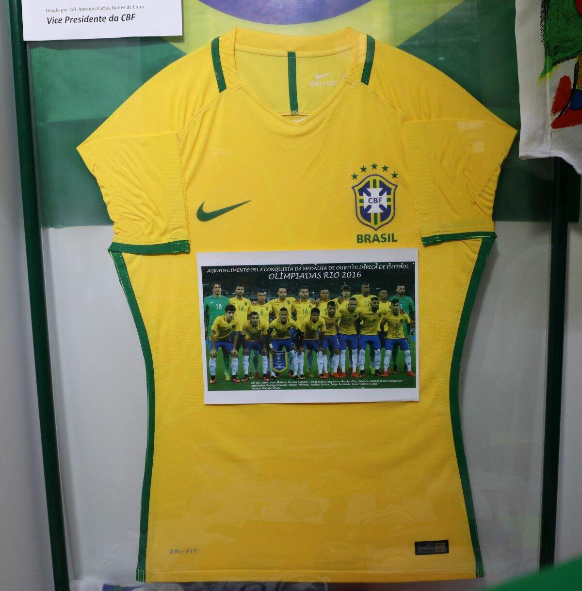 A camisa da Seleção Brasileira de Futebol Feminino também chama atenção na vitrine. O ex-voto está assinado por diversas jogadoras, que, inclusive, neste ano irão participar das Olimpíadas no Japão, como a Marta, Barbara, Formiga e Aline.