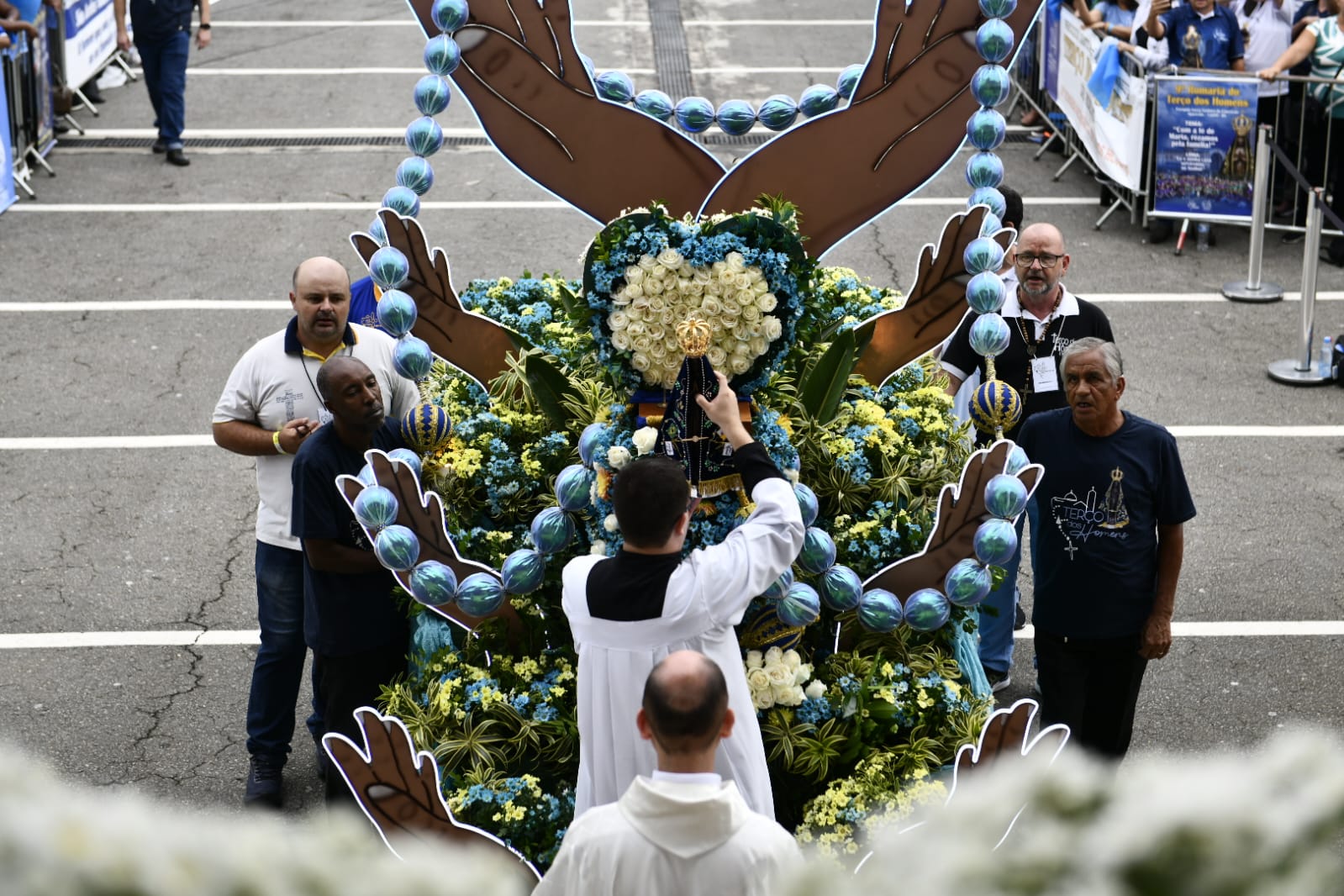Durante a Missa Solene na Tribuna Dom Aloísio Lorscheider, no Santuário Nacional, a imagem de Nossa Senhora Aparecida foi conduzida em um carro-andor ornamentado com um terço gigante, que atraiu os olhares e as preces dos romeiros.