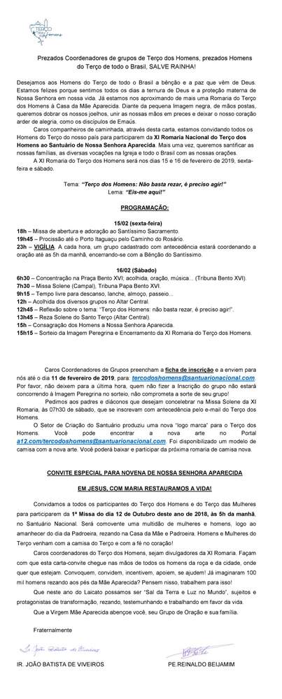 Confira a carta-convite preparada pelo reitor do Santuário, padre João Batista de Almeida, e o prefeito de Igreja, padre Reinaldo Beijamim.