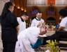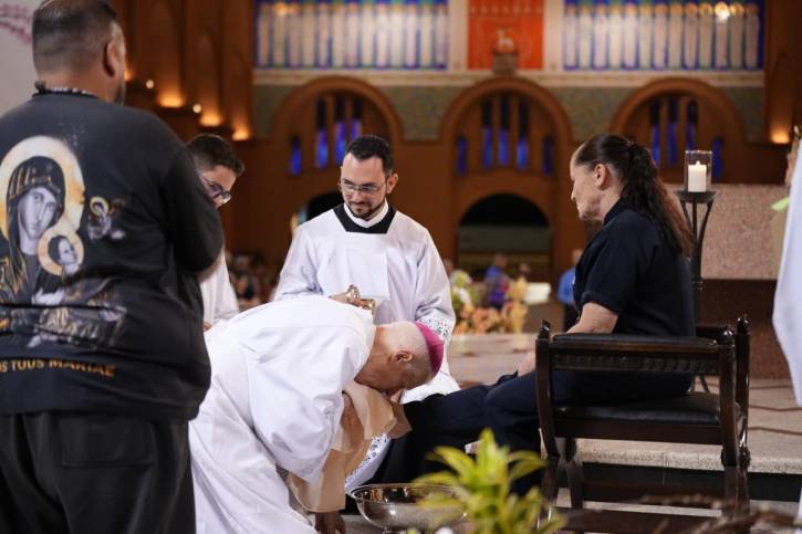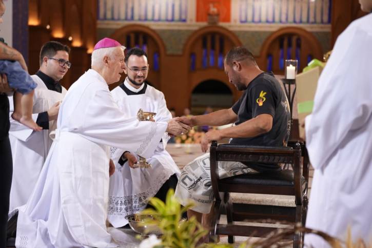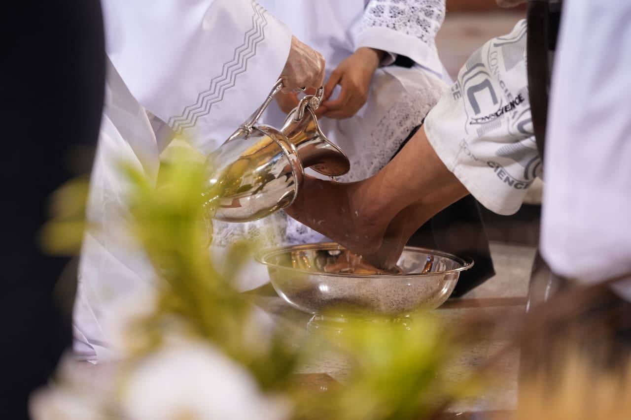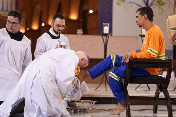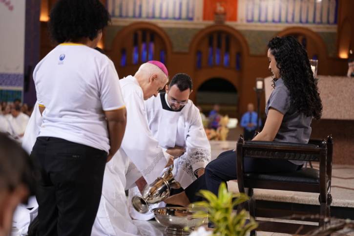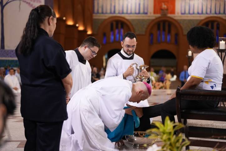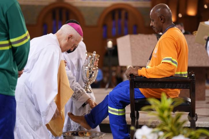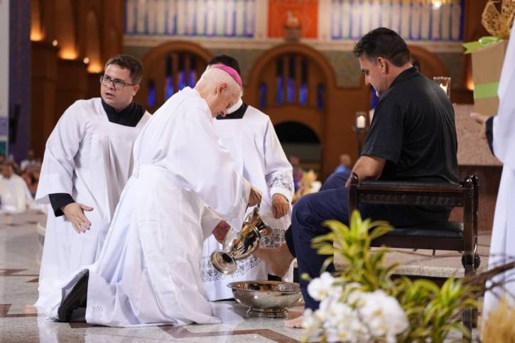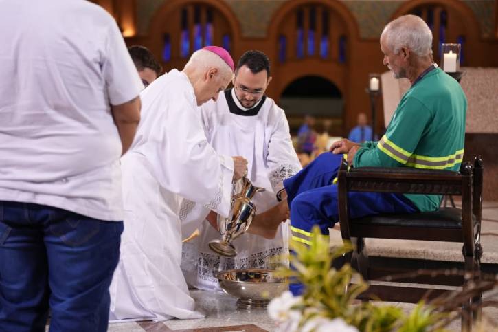 Nesta celebração, Dom Orlando lava os pés de algumas pessoas simbolizando o gesto de Jesus na última ceia, quando lavou os pés de seus discípulos. Neste ano, além de 6 colaboradores do Santuário Nacional, 3 colaboradores da Casa do Pequeno, o bispo também lavou os pés de três pessoas que ainda têm a rua como o seu lar.