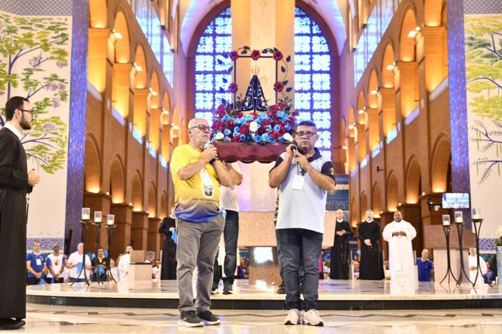 Os fieis primeiramente acolheram a imagem da Mãe Aparecida cantando o hino do Terço dos Homens com o Padre Antônio Maria. Os lenços azuis erguidos pelos devotos representavam o amor e a devoção de cada um à Nossa Senhora.
