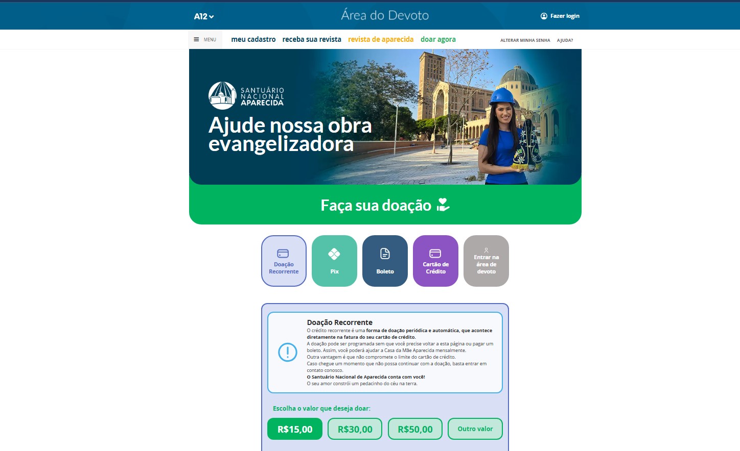 Outra forma para ajudar a Casa da Mãe é pela Área do Devoto, espaço gratuito onde o romeiro de Nossa Senhora pode se conectar ainda mais com a Padroeira, desenvolvendo a interatividade com o Santuário, fortalecendo o senso de comunidade e pertença, facilitando a atualização de dados pessoais e mais espaços com acesso a conteúdos especialmente feitos para quem está logado (notícias, mensagens de fé e materiais exclusivos).