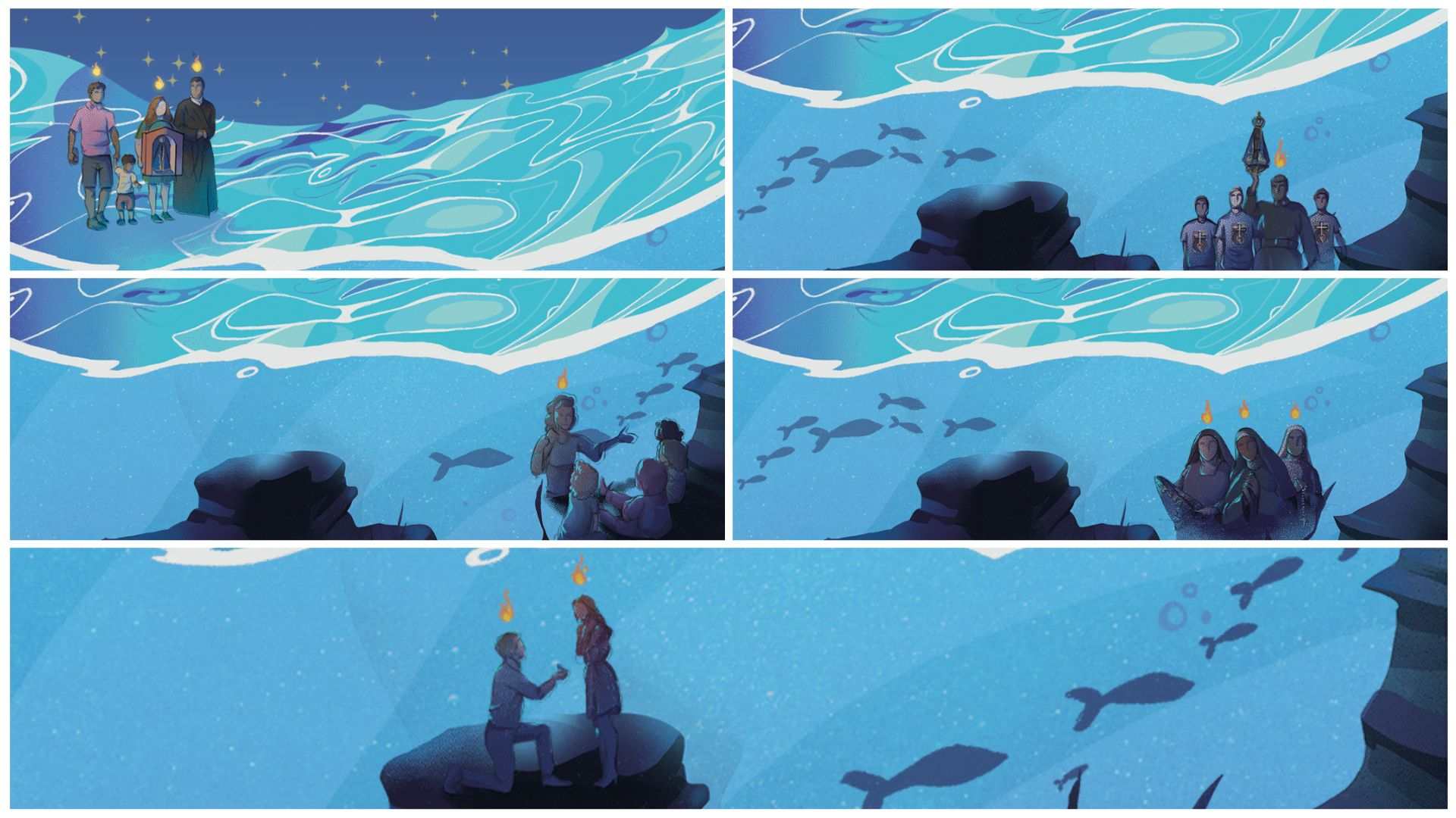 “Então a capa da Novena tem a presença de todas as vocações ali: a gente representa os meninos vocacionados redentoristas, a gente tem três religiosas, mas tem o religioso também que está lá junto com a capelinha, com a família, tem o pedido de casamento, tem a catequista dando catequese para as crianças, e tudo isso em torno de Nossa Senhora. E todos estão nessas águas profundas.
