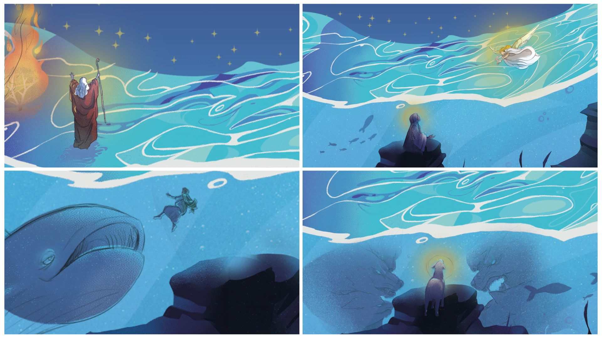 “A gente tinha que ter uma história pra contar ali, então eu fui buscando os chamados desde os tempos bíblicos. A gente começa com Moisés na Sarça Ardente. Depois você tem Jonas, que nega o chamado a ser profeta, então a baleia tá ali, e Jonas tá ali dentro do mar. [Temos também] Nossa Senhora durante a Anunciação, e aí a gente vai transitando pelos séculos e anos até chegar aos nossos tempos”.