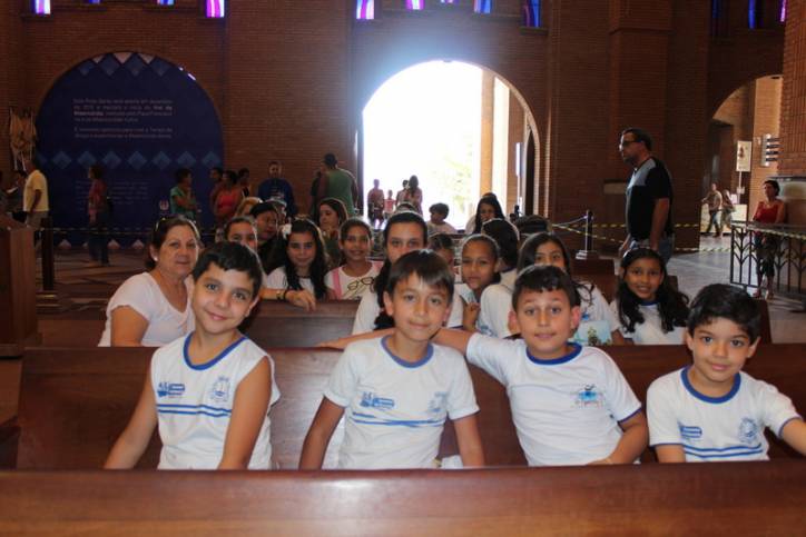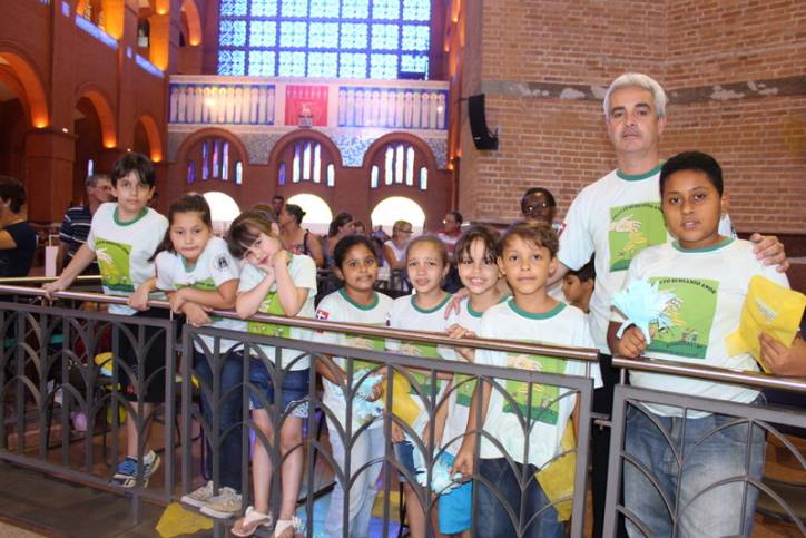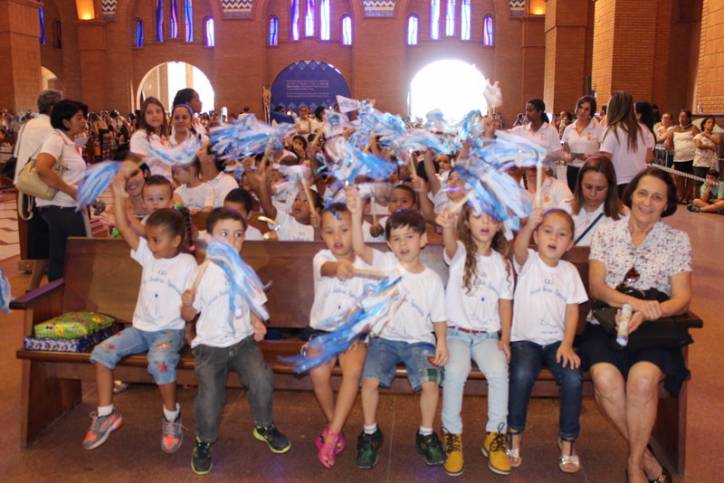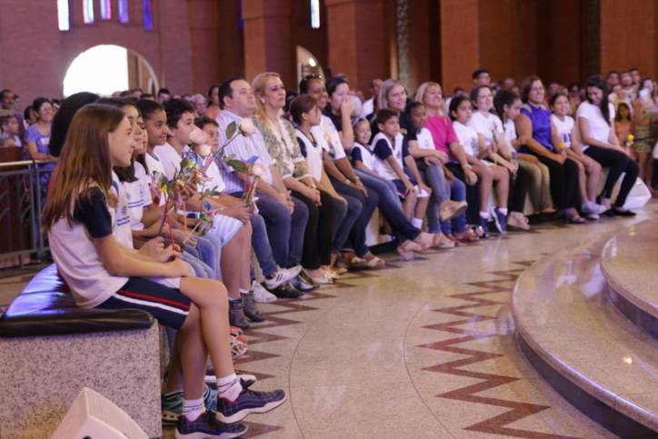 Atentos à celebração, participando e respondendo a tudo o que o padre perguntava, estavam às crianças de diversas escolas, entre elas, a Edgar Souza, o Centro de Educação Infantil Nossa Senhora Aparecida da cidade de Potim e Projeto Semeando o Amor, coordenado pelas irmãs Mensageiras do Amor Divino com o apoio do Santuário Nacional.