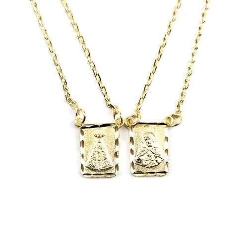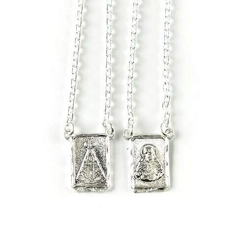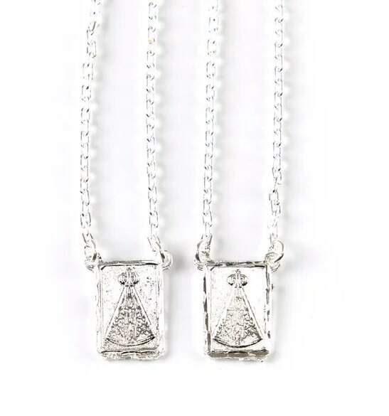 Nossa primeira sugestão é este lindo escapulário banhado a ouro com a imagem do Sagrado Coração de Jesus e Nossa Senhora Aparecida.