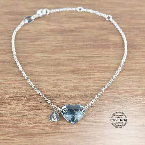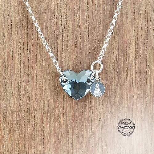 Banhada a prata, leva um delicado Cristal Swarovski na cor azul, lapidado cuidadosamente no formato de um coração, além da pequena medalha com a Imagem de Nossa Senhora Aparecida ao lado.