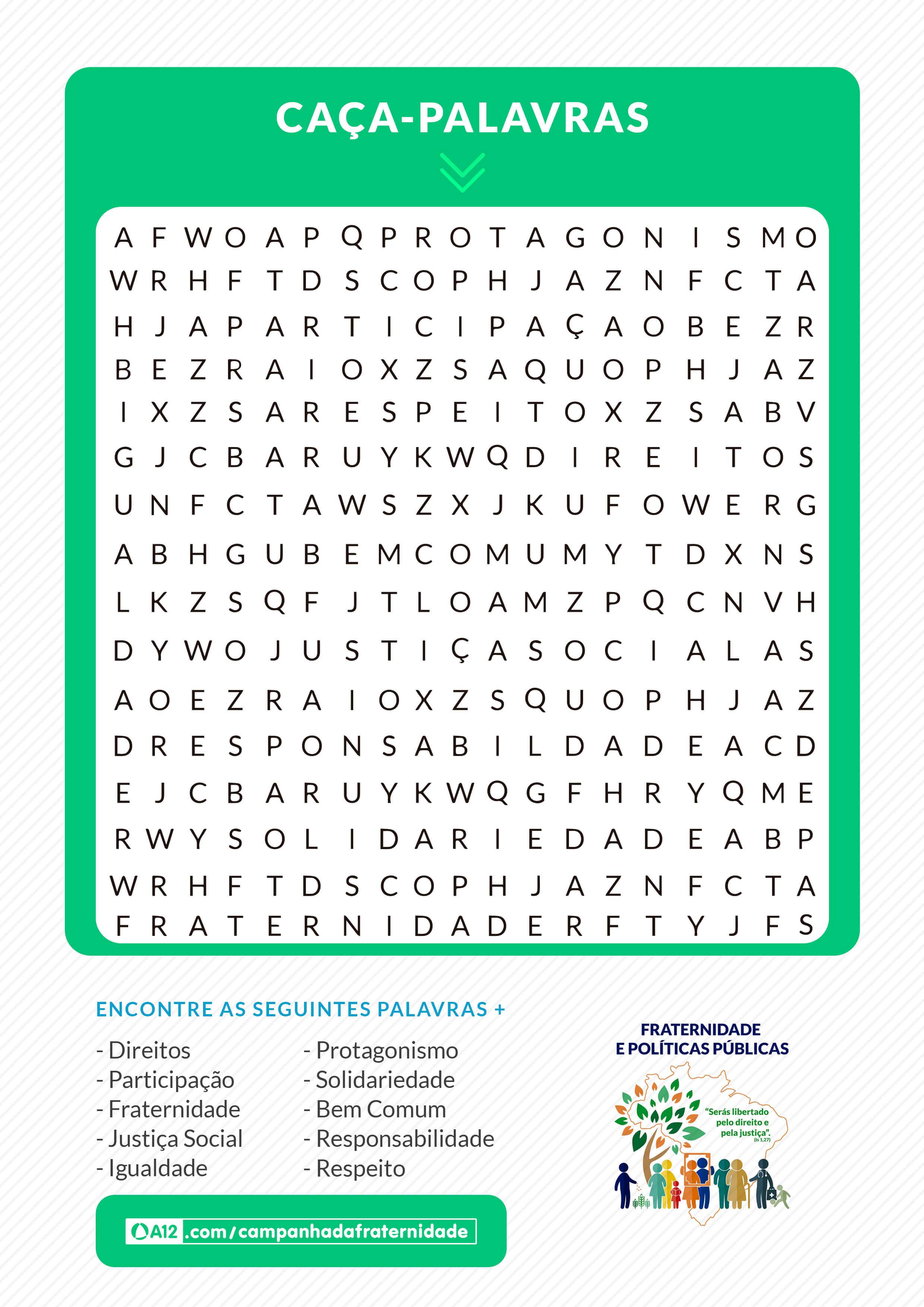 Neste ano, a Campanha da Fraternidade traz o tema “Fraternidade e Políticas Públicas” e o lema “Serás libertado pelo direito e pela justiça” (Is. 1, 27). O tema parece complicado para ser tratado com crianças e adolescentes mas, seguindo algumas das dicas abaixo, as famílias, os catequistas e professores terão uma boa oportunidade para refletir e pensar em ações práticas que motivem a consciência e a responsabilidade com o bem comum.