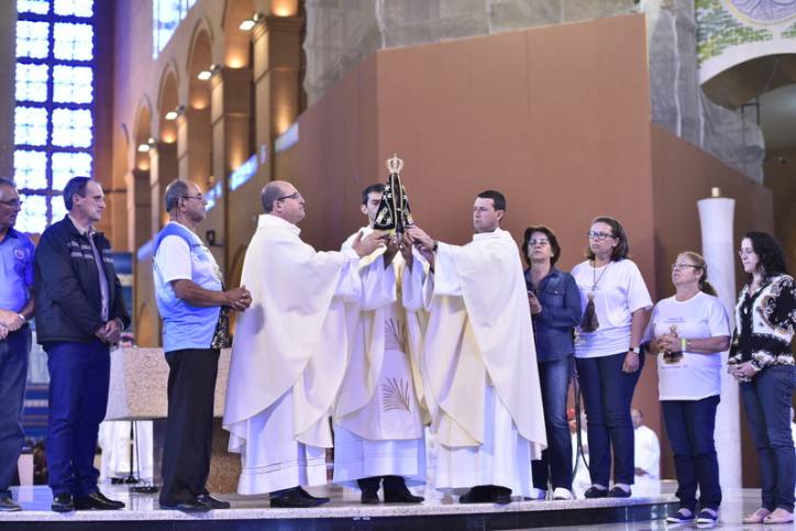 Dom Severino que é bispo de Caçador celebrou a missa das 9h no Altar Central da Casa da Mãe e recebeu a imagem de Nossa Senhora Aparecida que segue em peregrinação para a diocese catarinense.