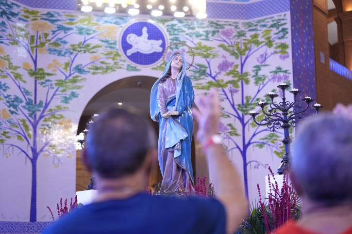 “É uma realidade tão presente, quando nós olhamos para esse momento tão desafiador da nossa história e da nossa vida, nós começamos a perceber e a ver aquelas mães que estão correndo com seus filhos na guerra. É muita dor, é muito sofrimento. Aquela mãe que carrega o seu filho vai rompendo todas as barreiras, porque ela carrega tudo que ela tem. Nesse momento nós queremos pedir a Maria que olhe de uma maneira muito especial por essas mães que neste tempo tão desastroso da guerra, elas abraçam com tal força os seus filhos que é incapaz de tirar dos seus braços.” (Pe. José Roberto)