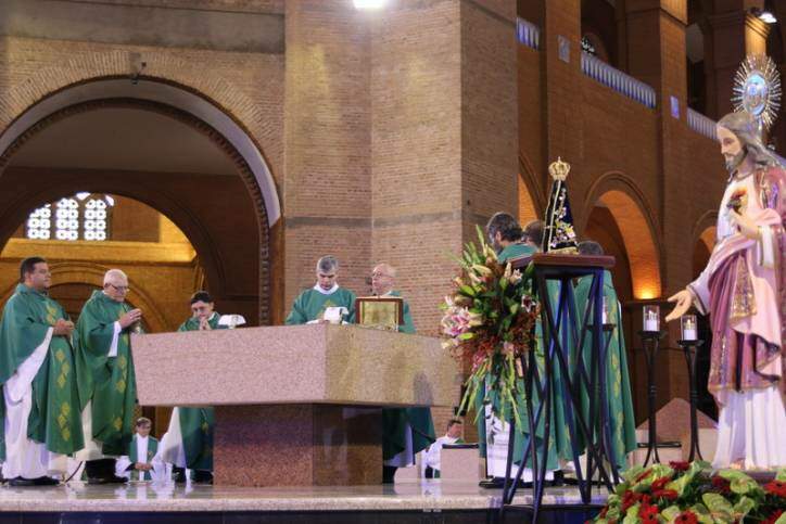 Os devotos acompanharam a Santa Missa, às 10h, presidida pelo bispo de Franca (SP), Dom Paulo Roberto Beloto.