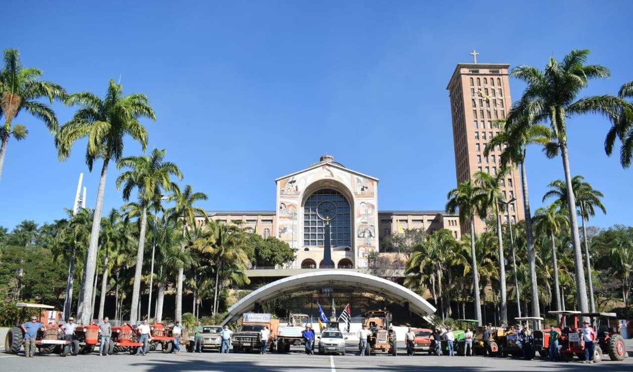 Após passarem pela Basílica Histórica de Aparecida, os tratoristas posaram para fotos no Pátio das Palmeiras com a sensação de dever cumprido.