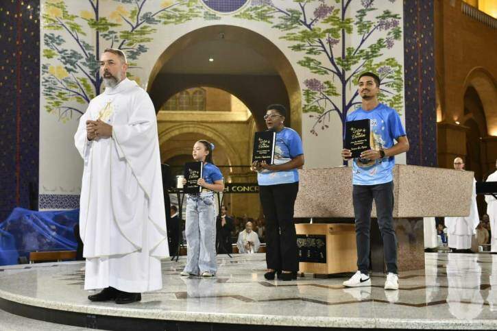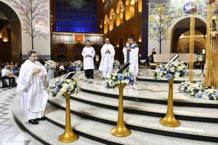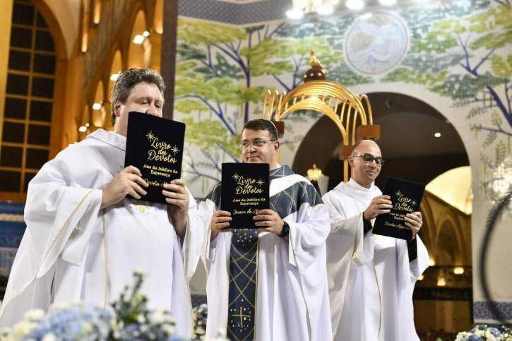 Após a homilia, ocorreu a entronização, sob o altar, dos três Livros dos Devotos do último ano, 2024/2025, para que todos os dias os nomes desses devotos que contribuem com a missão da Casa da Mãe Aparecida, estejam nas intenções diárias. O gesto é uma forma de manifestar agradecimento a todos que integram a Família dos Devotos.