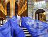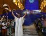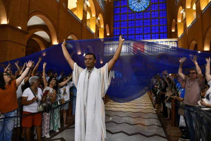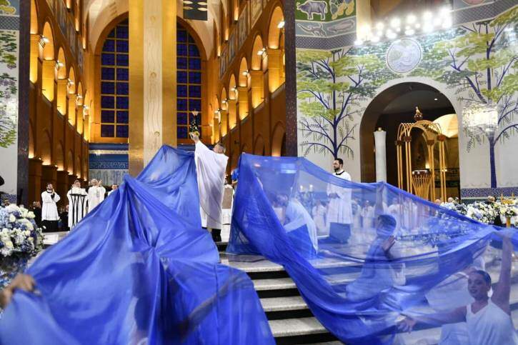 Num momento de grande expectativa, com a entrada solene da imagem da Padroeira, quatro grandes mantos azuis passaram por sobre as cabeças dos devotos, como que colocando todos sob sua proteção e também enviando a cuidar da vida. E, junto dos mantos, nas demais naves, entraram os três livros dos que apoiam a missão da Casa da Mãe, dos Devotos Missionários, Jovens de Maria e Devotos Mirins.